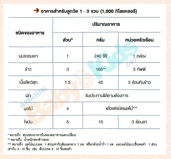 เด็กอายุ 1 – 3 ขวบ 1,000 กิโลแคลอรี
