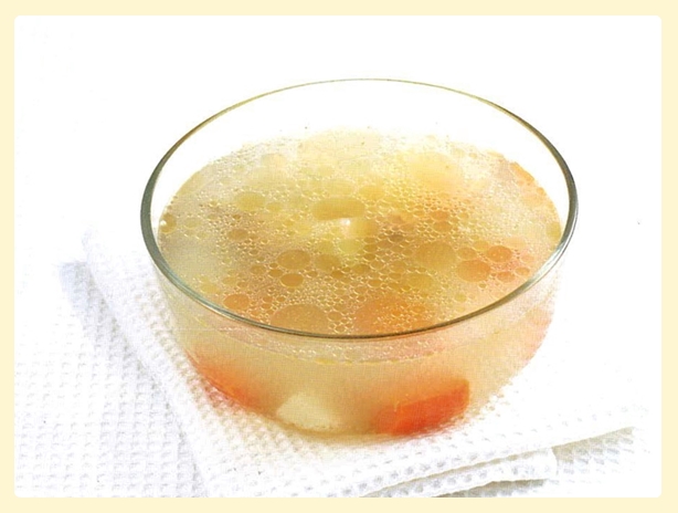 แล้วยกหม้อขึ้นตั้งไฟปานกลางจนเดือด จากนั้นลดไฟอ่อนลงแล้วเคี่ยวต่อประมาณ 30 นาที (หมั่นช้อนฟองออกเพื่อให้น้ำซุปใส) ยกลงจากเตา แล้วกรองผ่านกระชอน ก็จะได้น้ำซุปสำหรับนำมาใส่ทำ อาหารเด็ก