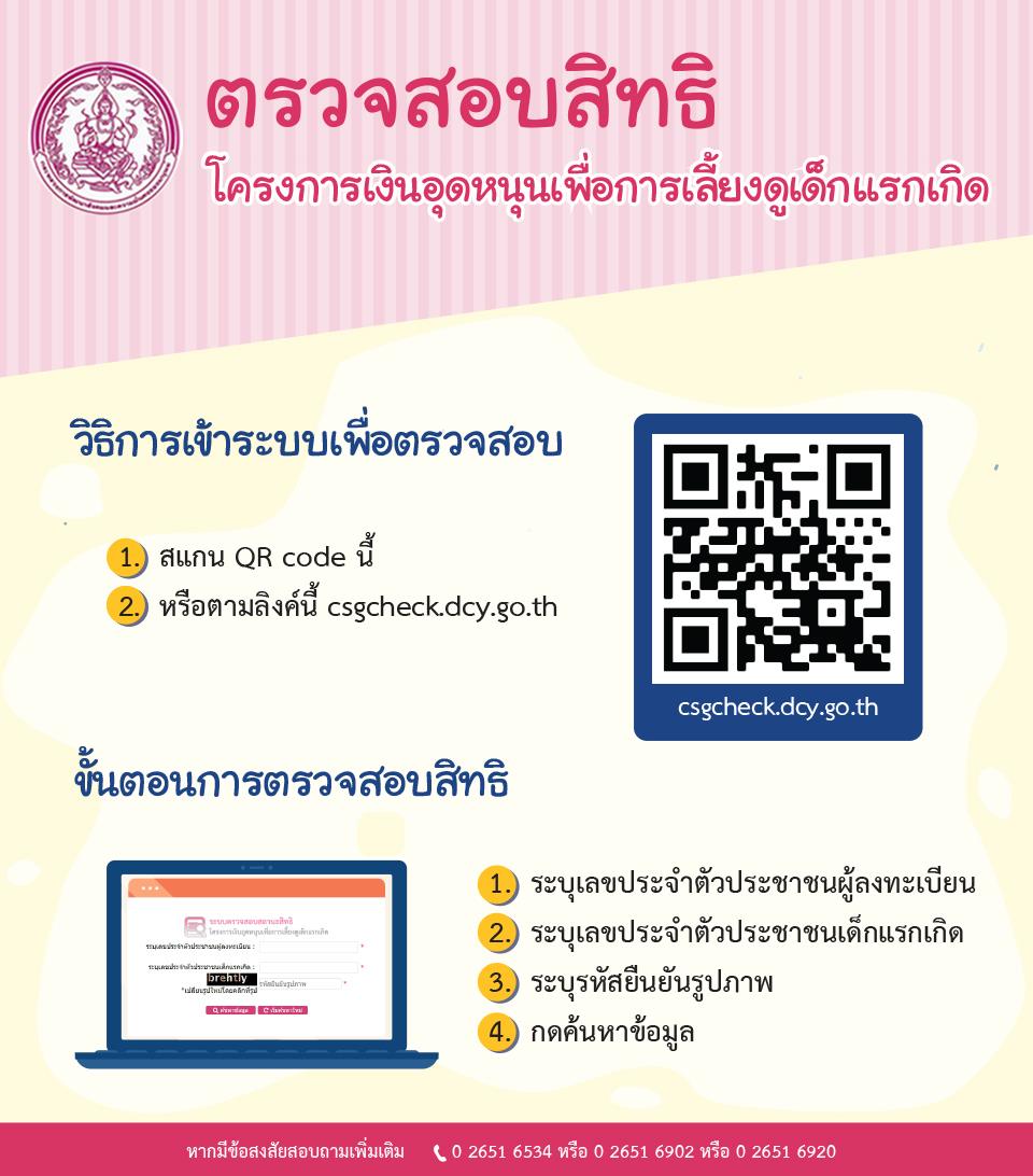 กรมกิจการเด็กและเยาวชน ได้ทำระบบตรวจสอบสิทธิของผู้มีสิทธิรับเงินอุดหนุนเพื่อการเลี้ยงดูเด็กแรกเกิด โดยใช้หมายเลขบัตรประชาชนของคุณพ่อ คุณแม่ และลูกน้อยที่ยื่นขอรับสิทธิเงินอุดหนุนฯ เข้าไปเช็คข้อมูลได้ ดังนี้