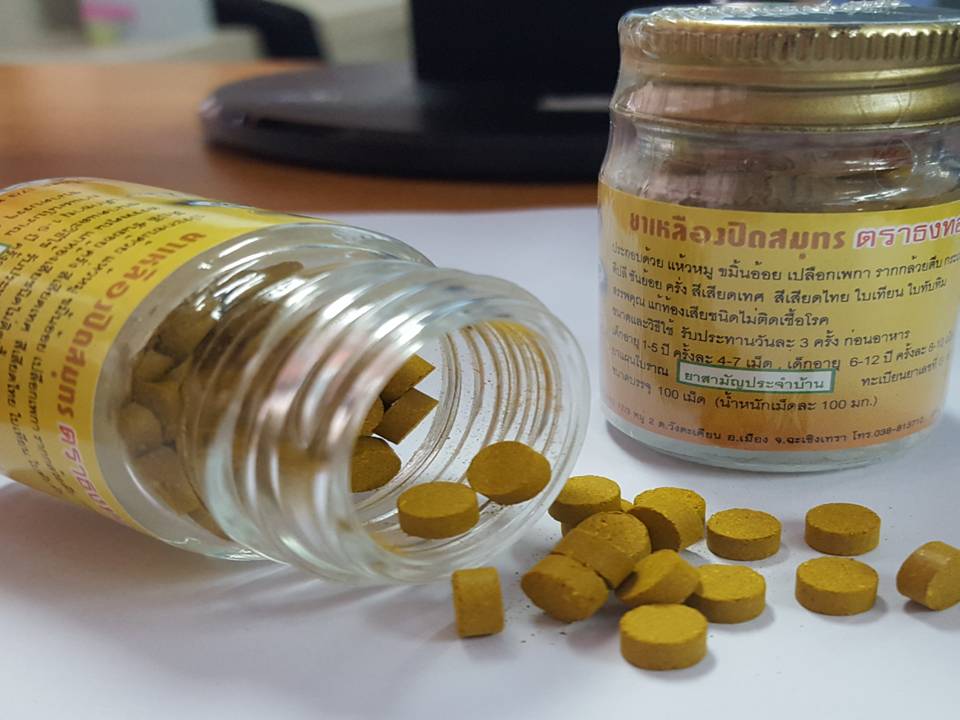 ยาเหลืองปิดสมุทร มีสรรพคุณ ช่วยบรรเทาอาการท้องเสีย โดยนำมาละลายกับน้ำเปลือกลูกทับทิม หรือน้ำต้มสุก แต่ต้องกินพร้อมกับน้ำละลายเกลือแกง เมื่อละลายยาแล้ว รับประทานวันละ 3 ครั้ง ก่อนอาหาร เด็กอายุ 3-5 เดือน ครั้งละ 2 เม็ด เด็กอายุ 6-12 เดือน ครั้งละ 3-4 เม็ด เด็กอายุ 1-5 ขวบ ครั้งละ 4-7 เม็ด เด็กโตอายุ 6 – 12 ปี ครั้งละ 8- 10 เม็ด