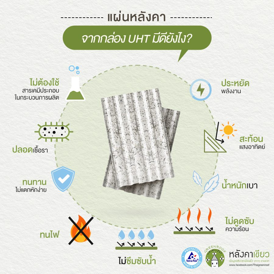 โดย หลังคาเขียว เป็นหลังคาที่ผลิตจากกล่องรีไซเคิลเป็นครั้งแรกในประเทศไทย โดย 1 แผ่น มีขนาด 1 x 2.40 เมตร และใช้กล่องเครื่องดื่มประมาณ 2,000 กล่อง ในการผลิต